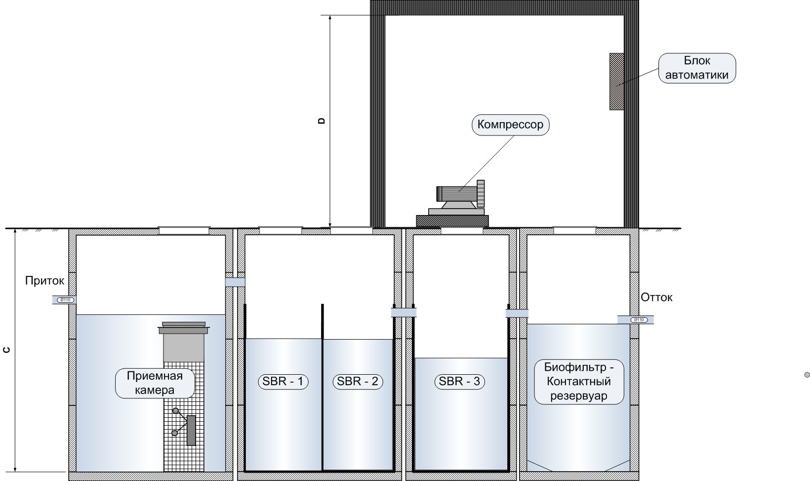 Компрессорная, как правило, изготавливается из сендвич-панелей и располагается рядом с биореакторами, в ней устанавливаются компрессоры, блок автоматики, оборудование для обеззараживания и т.д. При низком залегании грунтовых вод возможно расположение компрессорной заглублено или полузаглублено.