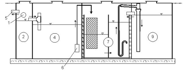 1 - приток дождевых вод; 2 - разделительный колодец-песколовка; 3 - загрязненный дождевой сток (20 минут дождя); 4 - приемный резервуар загрязненного дождевого стока; 5 - условно чистый дождевой сток; 6 - насос перекачки дождевых сточных вод в приемную камеру установки биологической очистки сточных вод BIOTAL (7); 8 - приток хозяйственно-бытовых сточных вод ; 9 - иловая емкость; 10 - подача раствора гипохлорита натрия; 11 - сборный колодец очищенных и обеззараженных сточных вод; 12 - сброс очищенных сточных вод в водоток, дренаж или на вторичное использование.
