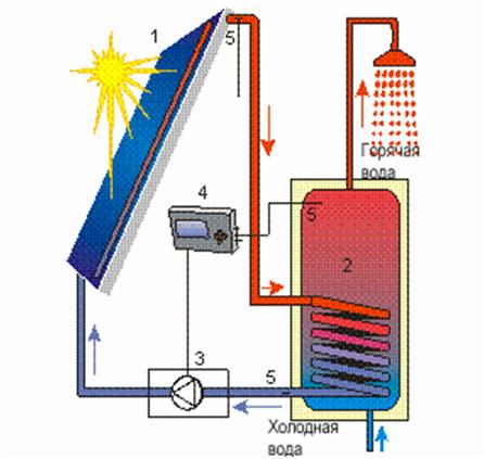 Гелиополе, состоящее из солнечных коллекторов и теплообменник емкости-накопителя соединяются между собой в замкнутую систему, в которой под давлением циркулирует теплоноситель. Коллектора, поглощая солнечную энергию, нагревает теплоноситель, который поступает в теплообменник ёмкости-накопителя, где отдает тепло сетевой воде. Циркуляция теплоносителя происходит за счет работы циркуляционного насоса. Электронный контроллер управляет работой циркуляционного насоса, включая его при достижении необходимой минимальной разности температур в коллекторе и теплообменнике или выключая при отсутствии целесообразности циркуляции.